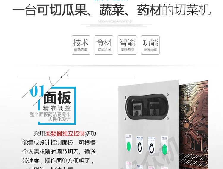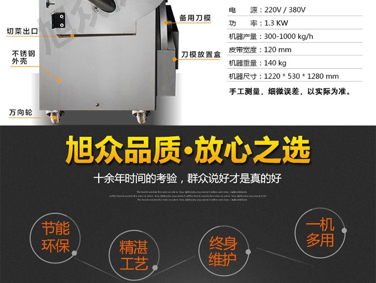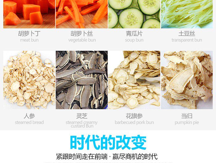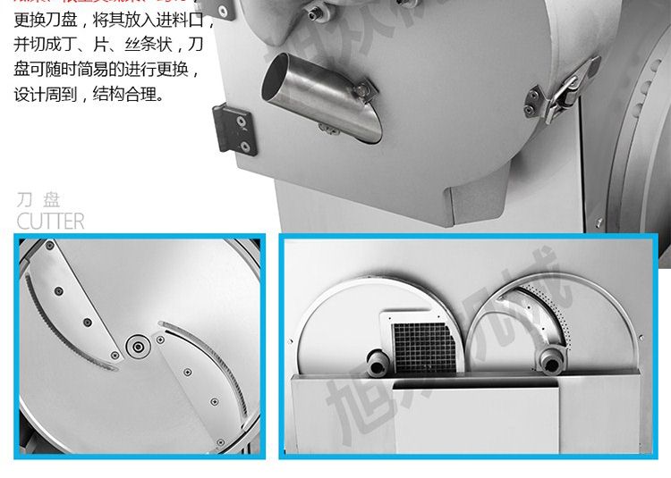 一機多用,可切葉菜及根莖類蔬菜,并可切片、絲、條、丁、段,碎等;根莖類,成品形狀:片、四角絲條、丁、斜片;葉菜類,切割尺寸:1-30mm可以調整。