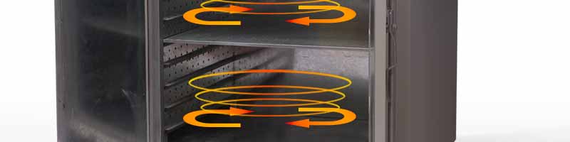 本運(yùn)風(fēng)箱分水平對(duì)流式和上下對(duì)流式兩種。工作室較小的采用水平對(duì)流式,發(fā)熱部分在上部,工作室較大的則采用上下對(duì)流式,發(fā)熱部分在上部。電機(jī)安裝在上部或后部,通過(guò)帶動(dòng)風(fēng)輪將熱量流通到工作室,如此循環(huán)。
