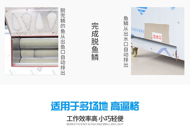 自動(dòng)魚鱗機(jī)廣泛應(yīng)用于魚類銷售市場(chǎng)、飯店、魚類加工廠等等,本產(chǎn)品不會(huì)對(duì)魚頭、魚尾、魚鰭造成損傷。該機(jī)器利用旋轉(zhuǎn)效應(yīng),使魚在運(yùn)動(dòng)中去鱗,去鱗干凈,對(duì)魚的加工去鱗屬國(guó)內(nèi)外首創(chuàng),主要指標(biāo)達(dá)到國(guó)際先進(jìn)水平。