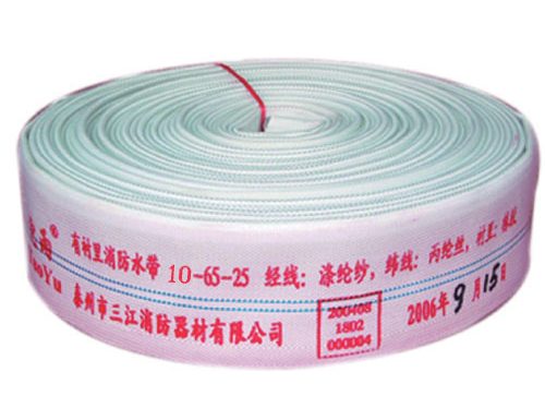 橡塑襯里消防水帶又名PVC消防水帶:水帶外層由滌綸紗、滌綸絲、丙綸絲編織而成,襯里為pvc。